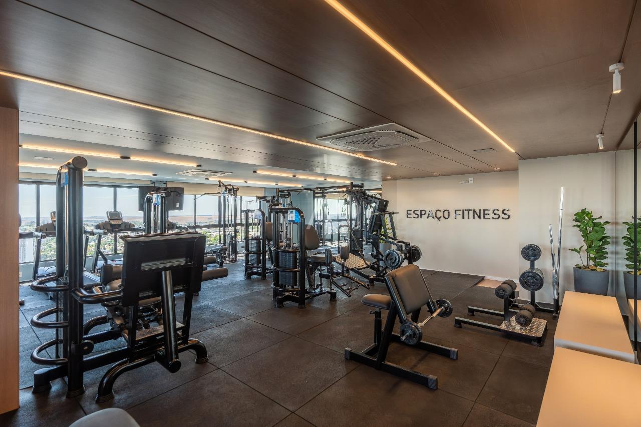 Espaço fitness no 28º andar com vista para a cidade